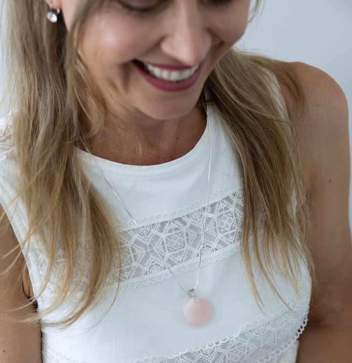 The elegant Rose Quartz Faceted Hexagon necklace creates a harmonizing field of a healthy negative charge up to 8 meters around the body. Be it at home or outside, the Rose Quartz necklace provides continued EMF protection that neutralizes the effects of over 30 harmful, noxious energies.
